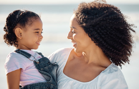 Mom with child at beach smile, make eye contact and black family happiness. Black woman with girl, happy spend time as mother and daughter, on family holiday or vacation by the ocean in Brazil