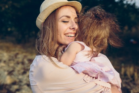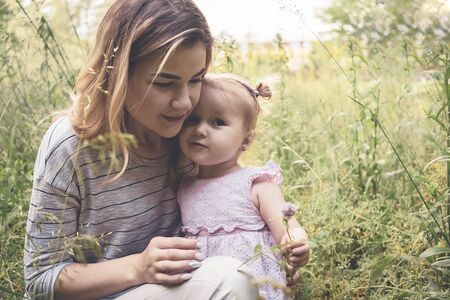 Beautiful mother and her little daughter spending time together in the field.