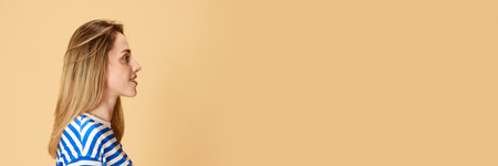 Profile view portrait of young girl in striped shirt posing, looking straigh against yellow studio background