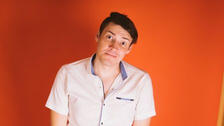 A young handsome man in a white shirt is offended by something or someone on an orange background