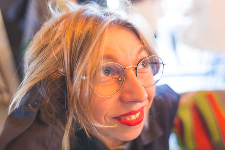 Portrait of a blonde in glasses. The smiling girl. Lips with red lipstick. A woman is sitting in a cafe.