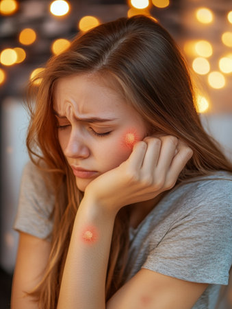 A young woman is showing signs of an allergic reaction, with noticeable redness on her arms. She appears distressed while sitting in a cozy, warmly lit environment.