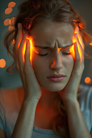 Close-up of a young woman pressing her temples with a pained expression and glowing red areas around her eyes depicting a severe migraine or sinus pressure while focusing on the need for wellness and.