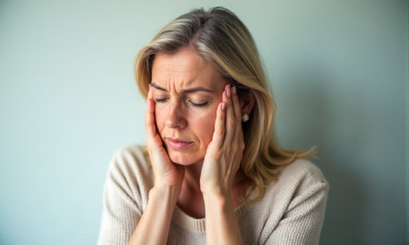 Woman experiencing panic attack symptoms during menopause, showcasing anxiety disorder with a distressed expression and hands on her face