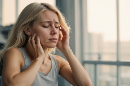Frustrated woman holding her head in pain, suffering from intense headache or migraine. Depressed female in distress, feeling stressed and overwhelmed, experiencing health problems