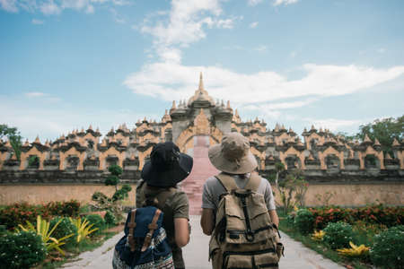 Behind two female traveler wearing a hat with backpack travel in the attraction architecture pagoda of buddhist culture in southeast Asia. Pagoda of Buddhist in Thailand.