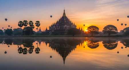 A breathtaking sunrise illuminates ancient pagodas and numerous hot air balloons floating above a misty valley. The warm golden light creates a serene and majestic atmosphere perfect for travel and adventure themes.