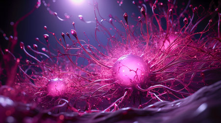 This image shows a close-up of an object that appears to be organic in nature, resembling a microscopic view of a cellular structure. The central focus is an orb-like formation with clusters of smaller, bead-like structures on its surface. Surrounding this are numerous filament-like protrusions, some with branching extensions, all against a dark background. The object and its protrusions are in various shades of pink and red, and theres a translucent quality to some of the extensions, giving a sense of depth and complexity. Water droplets are visible across the surfaces, suggesting a wet environment and adding a reflective quality to the image. The overall appearance is reminiscent of an image you might see in biology or microbiology related to cellular organisms, perhaps a virus, a sea anemone, or a stylized depiction of a cancer cell.