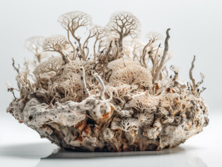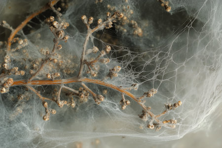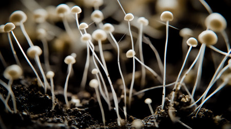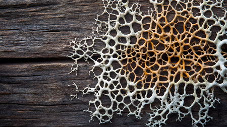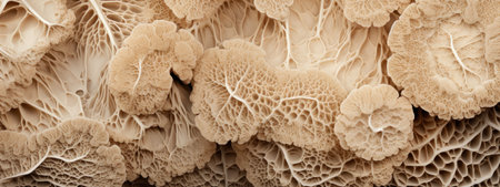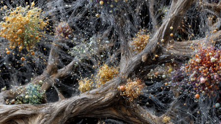 Close-up of mycelium texture, intricate fungal threads in natural patterns. Microscopic view of mycelium, symbolizing complex organic growth