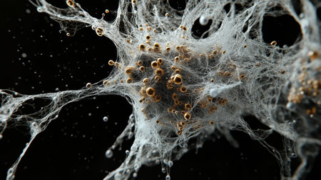 Close observation reveals a complex arrangement of fine filaments interconnected with small spherical particles. This captivating structure highlights the beauty of microscopic environments