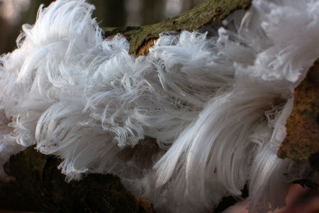 An unusual natural phenomenon - mysterious hair ice on wood looks like angle hair. The fungus Exidiopsis effusa is responsible for this crystallization process.