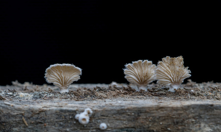 Close-up fungus growing ,Mushroom on a wood dark background with copy space