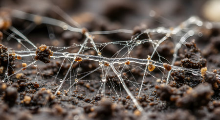 An extreme macro photograph of a delicate mycelium network, or fungal threads, spreading through rich soil with tiny water droplets clinging to it. The image represents concepts of ecosystem, connection, life, nature's network, and biology.