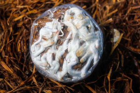 Psilocybin mushroom. Mycelium filaments on coconut fiber mycelium.