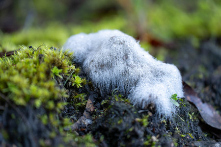 Tiny Slime mold growing on the forest floor macro photography close-up of penicillin, green mold, white fluff of tender Mold in the sun. Abstract closeup of penicillin Small mushrooms growing on a dried lemon peel. Fruit mold.
