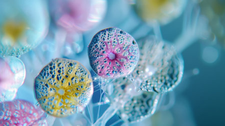 This stunning microscopic image captures the beauty of colorful microorganisms in an aqua background, showcasing intricate details and soft glowing light effects.