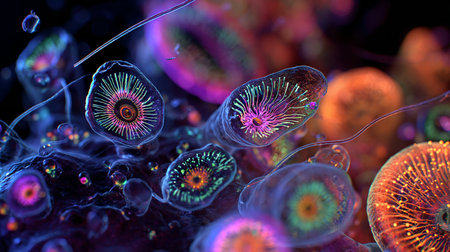 Discover a captivating microscopic world with colorful microorganisms floating gracefully in a liquid environment, showcasing intricate shapes and unique textures.