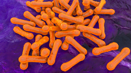 Scientific image of bacteria Corynebacterium showing their characteristic morphology, rod-shaped bacteria with wider ends and club shape appearance, 3D illustration. C. diphtheriae and other