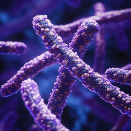 Researchers observe vibrant purple bacteria through a microscope, showcasing intricate structures and textures typical of microbial life. The environment highlights the science of microbiology.