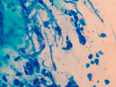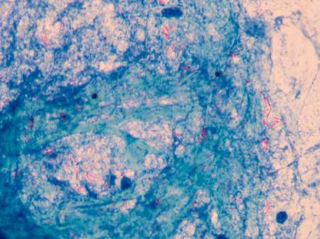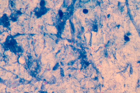 Mycobacterium tuberculosis positive (small red rod) in sputum smear, acid-fast stain, analyze by microscope 1000x