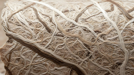 A detailed view of a coarse, natural fiber bundle featuring complex interlacing strands and warm earthy tones, emphasizing its rich, tactile surface and layered structure.