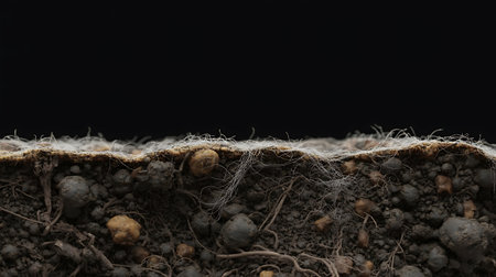 Plant roots growing through soil. Intricate network of roots in rich, dark soil surrounded by organic debris and small stones