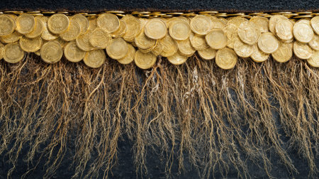 Cross-section shows roots intertwined with gold coins, symbolizing the connection between nature and financial growth.