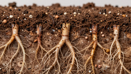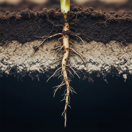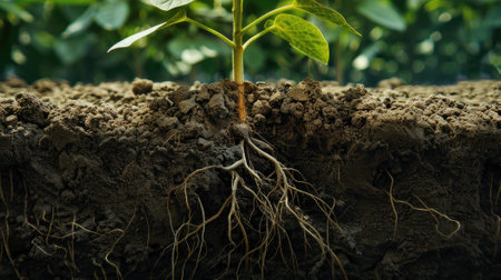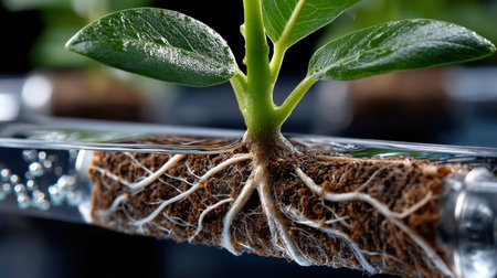 Roots extend into soil, showcasing the connection between plant life and earth. Small particles and organic matter are visible, demonstrating nutrient absorption.