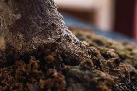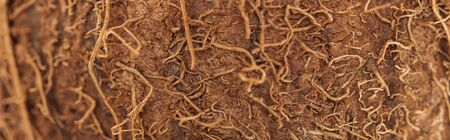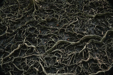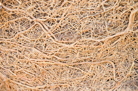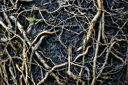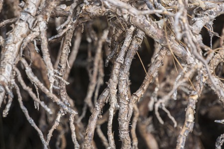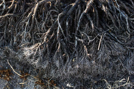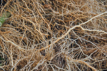 The roots of plants are similar to vessels and capillaries close-up. Textured thick roots.