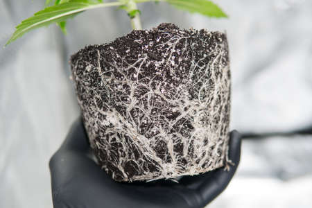 Roots In the hands of the grower. the beautiful roots of the marijuana plant. Macro healthy cannabis roots. CBD in roots Marijuana. Professional cannabis cultivation grow.