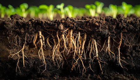 A detailed cross-section view reveals the hidden world beneath the surface. A complex network of roots anchors young green seedlings, drawing life from the rich, dark earth, symbolizing foundation, potential, and new beginnings.
