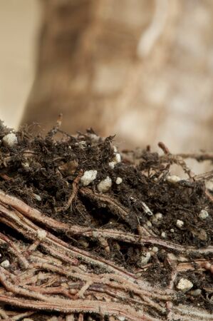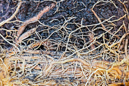 Soil and root structure, network of roots under soil, plant root. The root of the plant is in the soil.