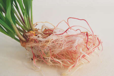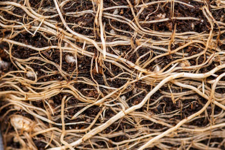 Shaggy white roots of the plant in wet ground. Macro image with blurred background.