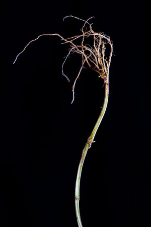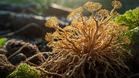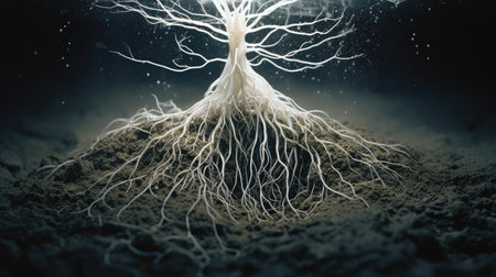 A detailed view of a plants root system with tiny roots branching out in all directions