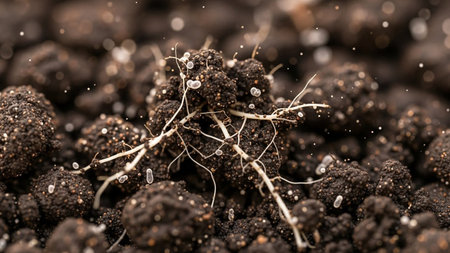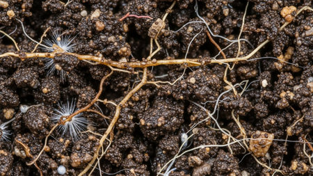 A detailed macro shot showcases the intricate network of white plant roots emerging from dark, textured soil, with tiny particles suspended in the air.