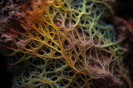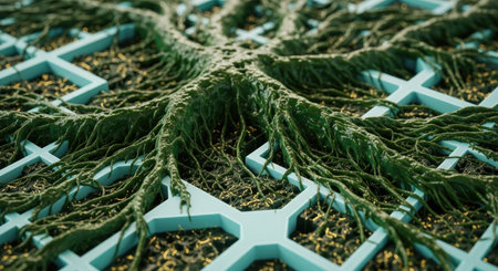 A detailed and complex, 3D rendering of a section of a plant’s root system, with the main root and smaller