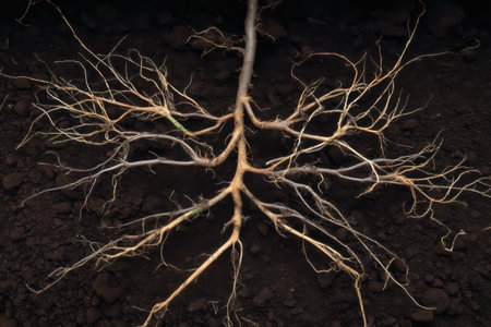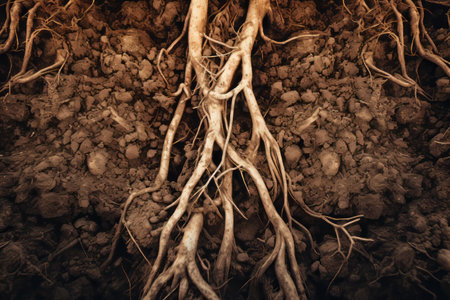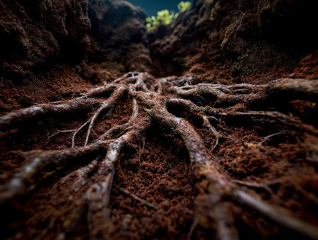 Intricate roots delve into fertile, shadowy earth, revealing nature?s underground network in a peaceful outdoor environment.