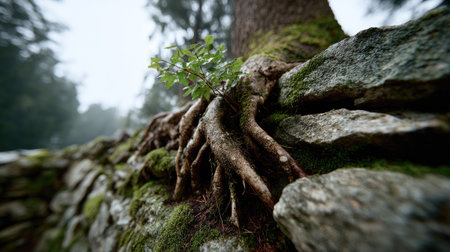 This close-up image showcases the intricate details of tree roots merging with rocky terrain, surrounded by lush greenery and moss. Ideal for nature themes.