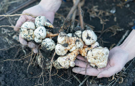 Farmer digs autumn Jerusalem artichoke. Autumn harvest in the garden. The man is holding a fall harvest of sunroot. Big harvest raw organic tuber topinambur in the bed. Production of Sunchokes syrup.