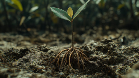 A small green plant emerges from dark, rich soil, showcasing its delicate roots, symbolizing the beauty of nature and the importance of ecological growth and sustainability.