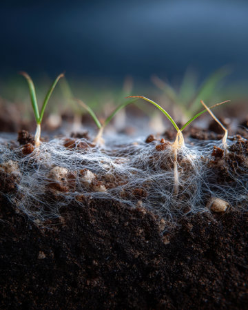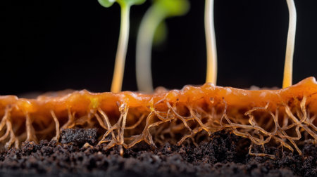 Detailed view of a complex network of plant roots intertwined with dark soil and emerging seedlings, showcasing underground growth.
