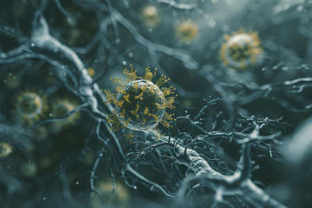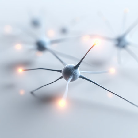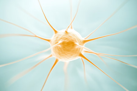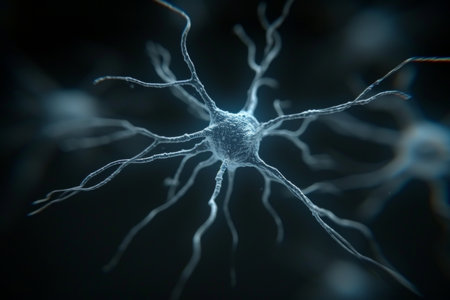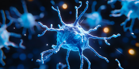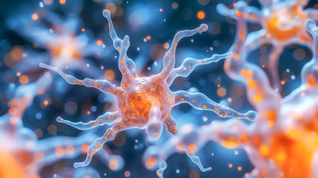 Abstract representation of glowing neurons interconnected in a scientific illustration showcasing the complex networks of the human brain and cellular communication.