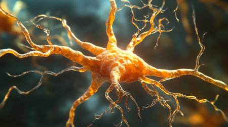 An artistic representation showcases a neuron cell. It displays an intricate network of radiating tendrils with vibrant orange hues against a dark background. The lighting highlights the cell's form. This image is suitable for various commercial uses, including science, medical publications, and educational materials.