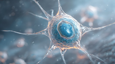 Highly detailed 3D illustration of a single biological cell with multiple filaments or receptors, suspended in a soft-focus scientific background. No people.