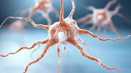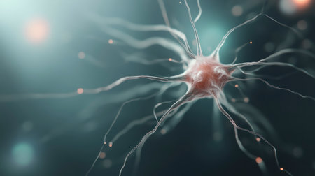 Close-up of neural cell with glowing synapses, biological study. Neuroscience and innovation concept