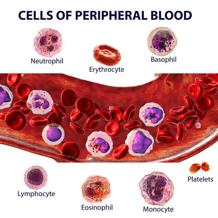 Blood flow. 3D illustration showing different types of blood cells, erythrocytes, neutrophil, monocyte, basophil, eosinophil, lymphocyte, and platelets. Labelled image