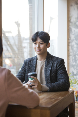 Asian couple dating in coffeeshop - close up shot of a man with smile