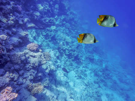 underwater world of the sea, two butterfly fishes, corals, against the background of the sea bottom and the blue depth of the sea, the Red Sea, Egypt.
