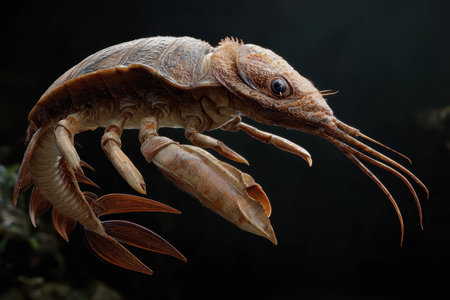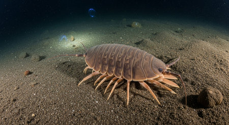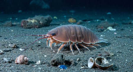 Close-up of a Sea Roach exploring a dark environment, showcasing its segmented body and delicate antennae, macro photography and don't have generated by AI.