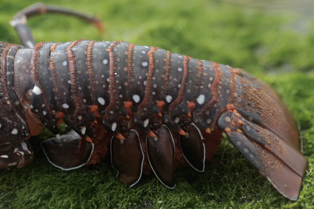 A stunning close-up of a colorful lobster navigating through a vibrant underwater habitat, showcasing the beauty and diversity of marine life amidst coral and algae.